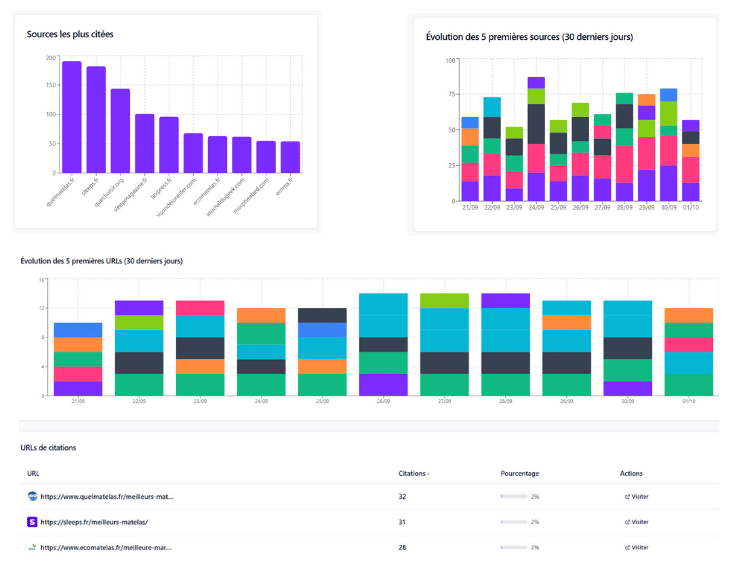 - Suivi des mentions directes de votre marque dans les réponses IA